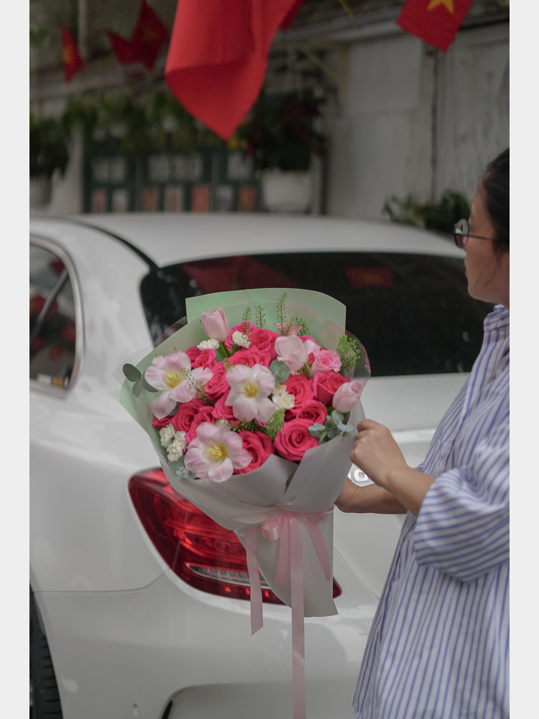 Chụp hình hoa trước khi giao đi
