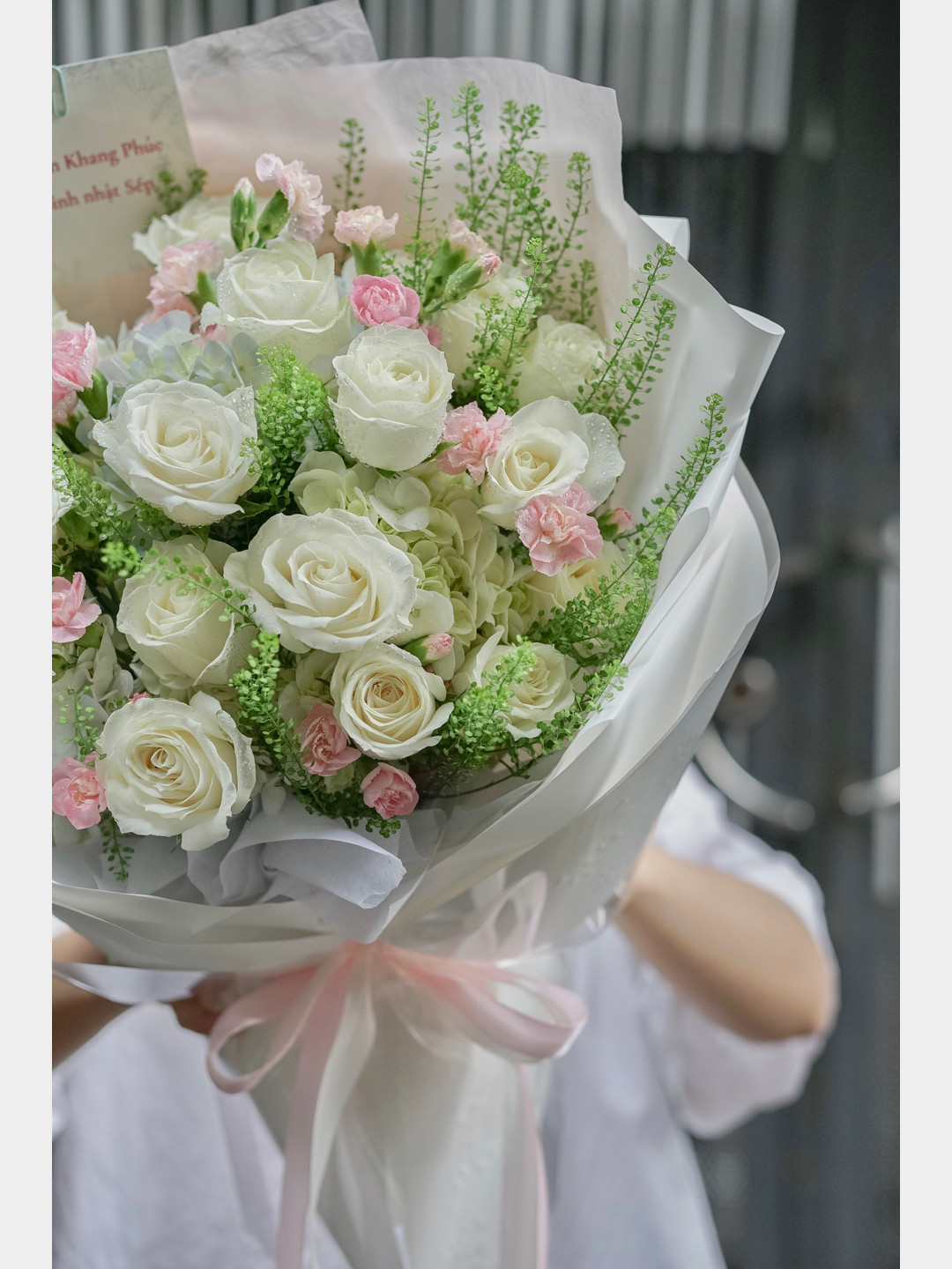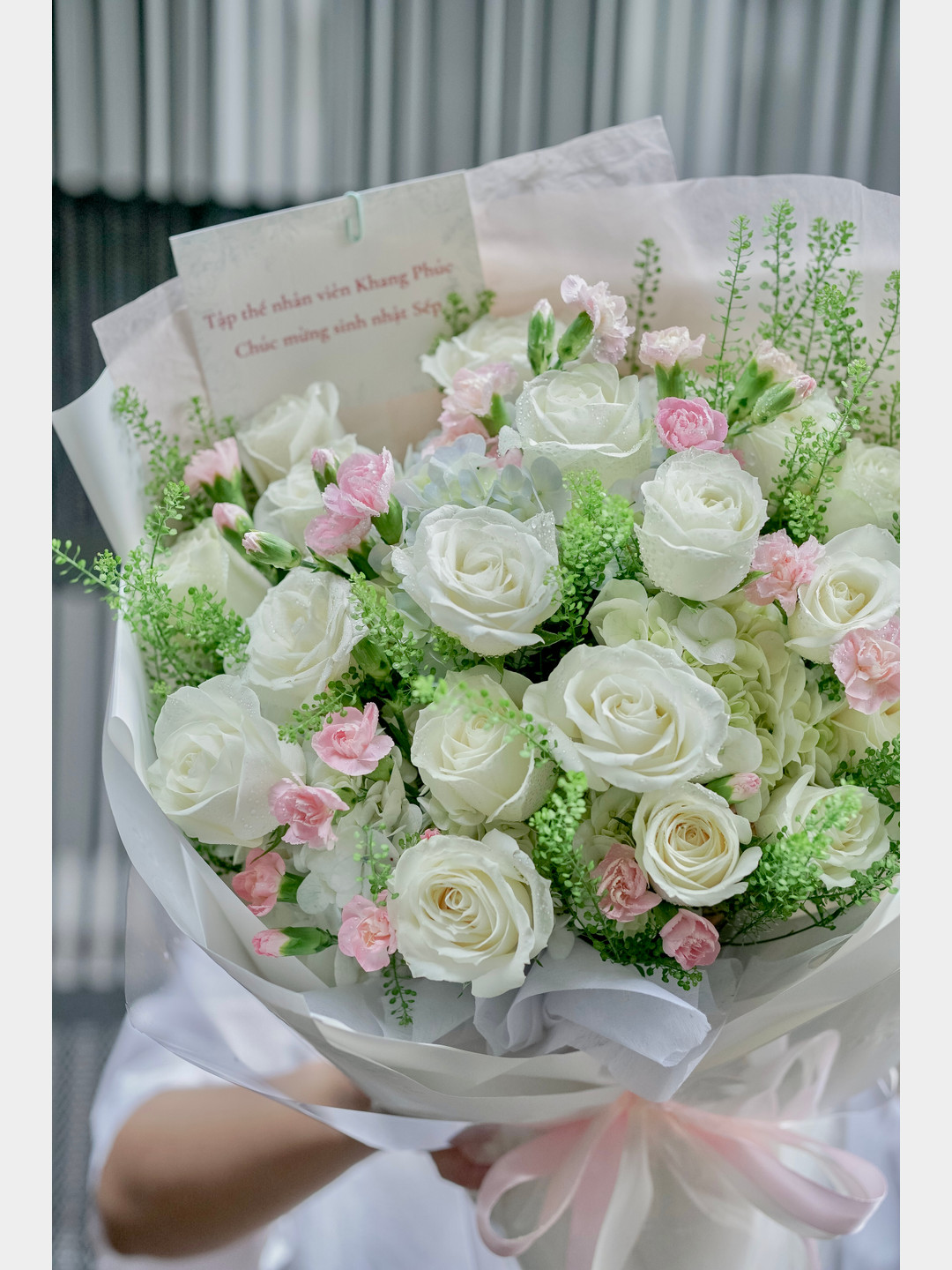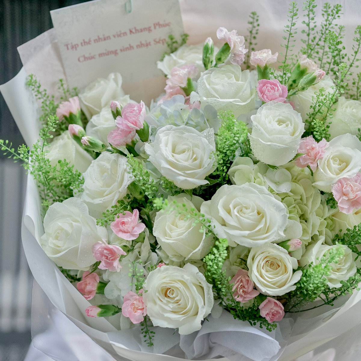 Bó hoa hồng trắng - bó hoa sinh nhật tặng bạn gái không chỉ mang vẻ đẹp tinh khiết, mà còn thể hiện tình yêu chân thành và sự trân trọng dành cho người ấy. Hãy chọn bó hoa này để gửi gắm những lời chúc tốt đẹp, làm cho ngày sinh nhật của bạn gái thêm phần ý nghĩa và lãng mạn!