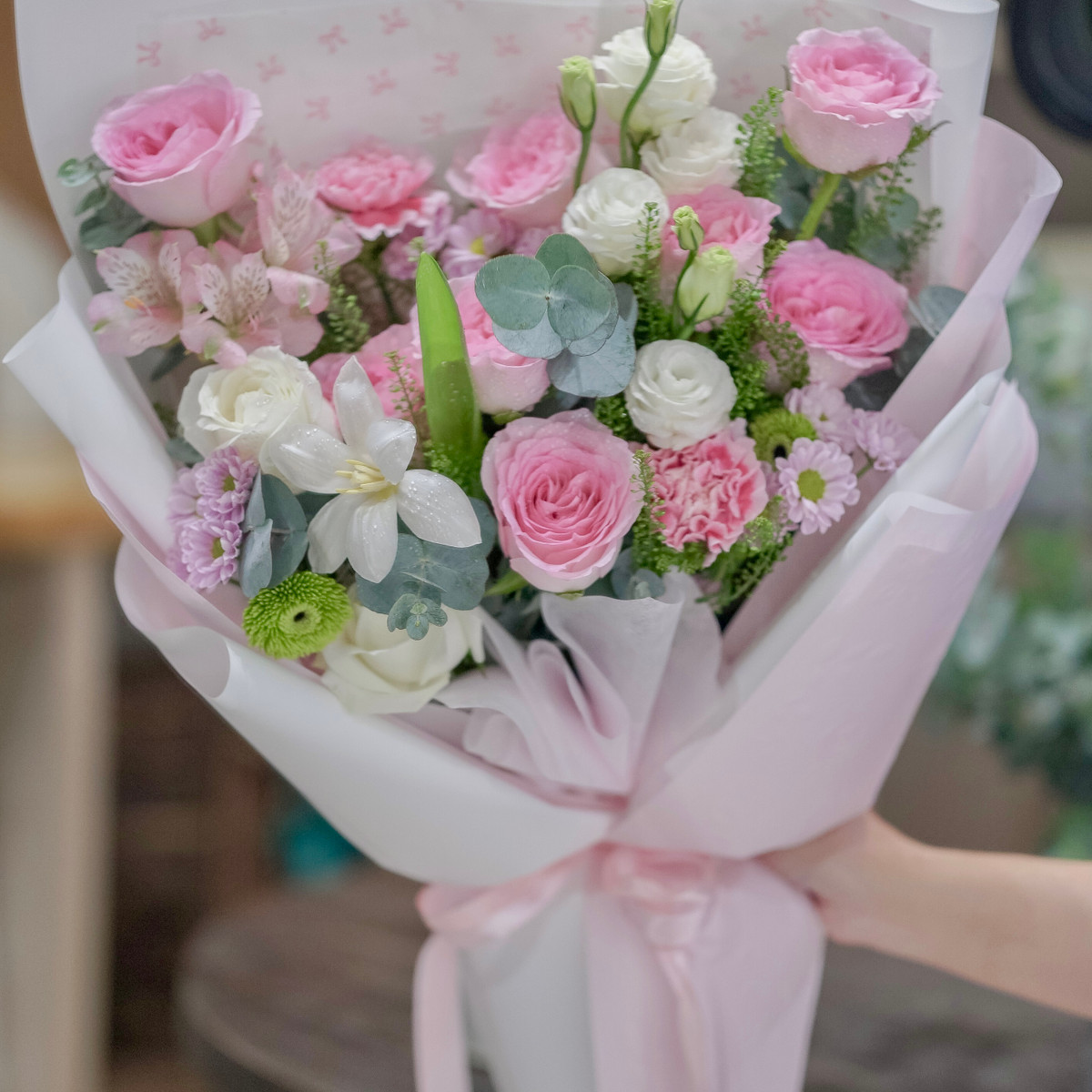Bó hoa tone hồng trắng tặng sinh nhật người yêu không chỉ là món quà tuyệt vời để thể hiện tình cảm chân thành, mà còn mang đến vẻ đẹp dịu dàng và lãng mạn cho ngày đặc biệt của họ.