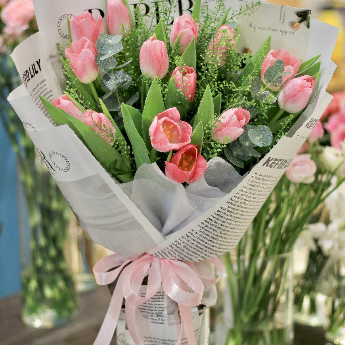Bó hoa tulip hồng sang trọng phù hợp tặng người yêu, tặng vợ nhân dịp các ngày lễ kỉ niệm đặc biệt, hoặc tặng sếp, đối tác nước ngoài