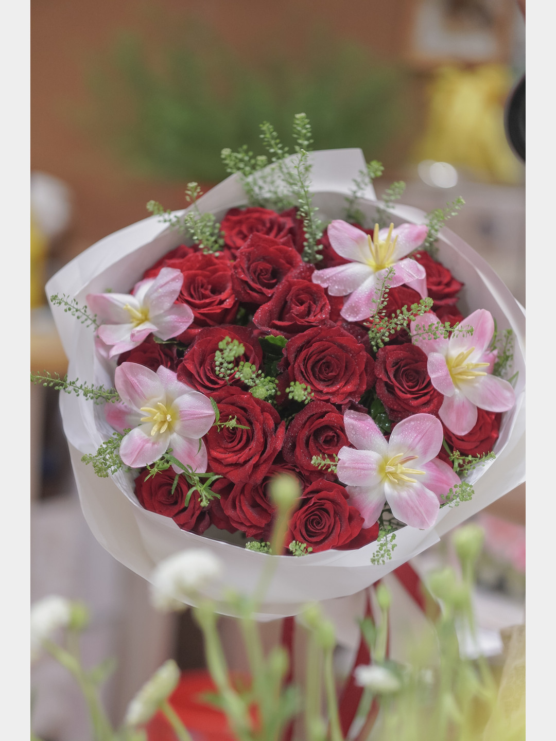 Bó hoa hồng đỏ mix tulip là món quà tuyệt vời để gửi gắm lời chúc mừng sinh nhật rạng rỡ đến người bạn thân yêu trong ngày đặc biệt. Sự kết hợp giữa sắc đỏ nồng nàn và vẻ đẹp thanh thoát của tulip mang đến không gian tươi mới, ngập tràn năng lượng tích cực và niềm vui. Hãy để những đóa hoa tươi thắm thay bạn viết nên những kỷ niệm đẹp, thắt chặt thêm tình bạn gắn bó và chân thành.