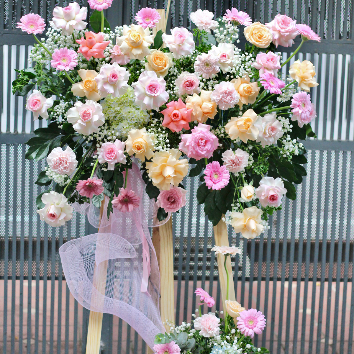 Kệ hoa tone trắng hồng mừng khai trương tone màu nữ tính phù hợp tặng shop thời trang. Tone màu dễ thương nhưng không kém phần nổi bật hiện đại giúp bạn có lựa chọn mới mẽ gửi tặng người thân nhân dịp khai trương