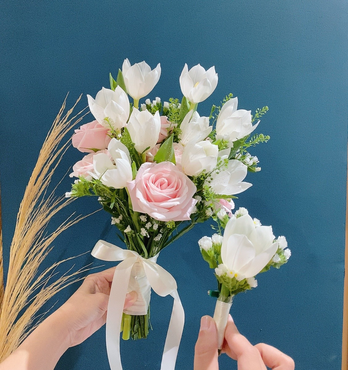 Bó hoa cưới tulip trắng phù hợp 1m55-1m65