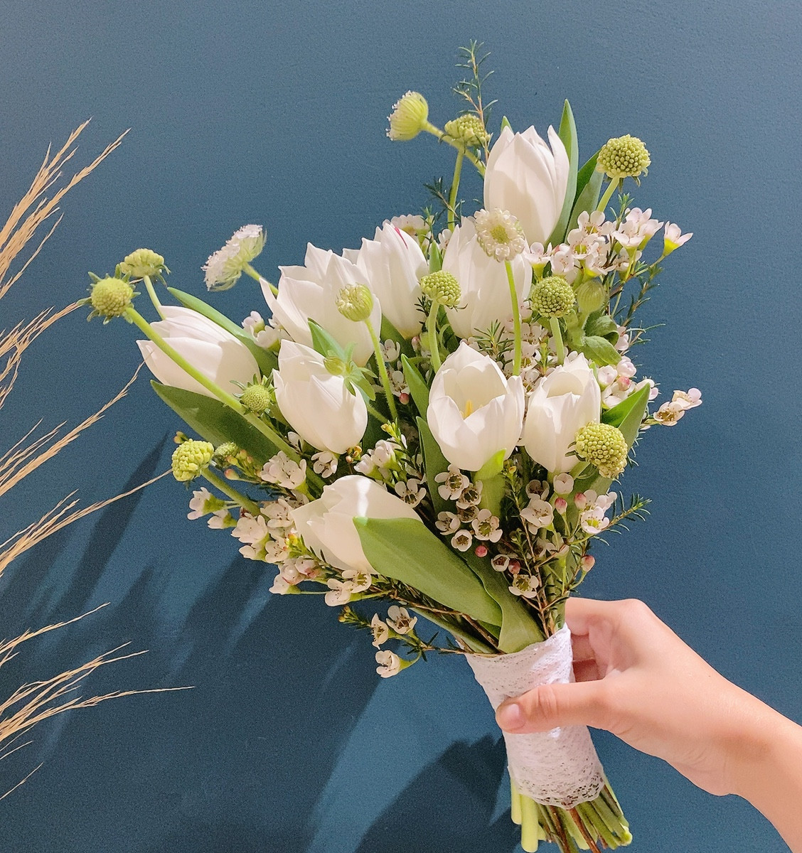 Bó hoa cưới tulip trắng phù hợp 1m55-1m65