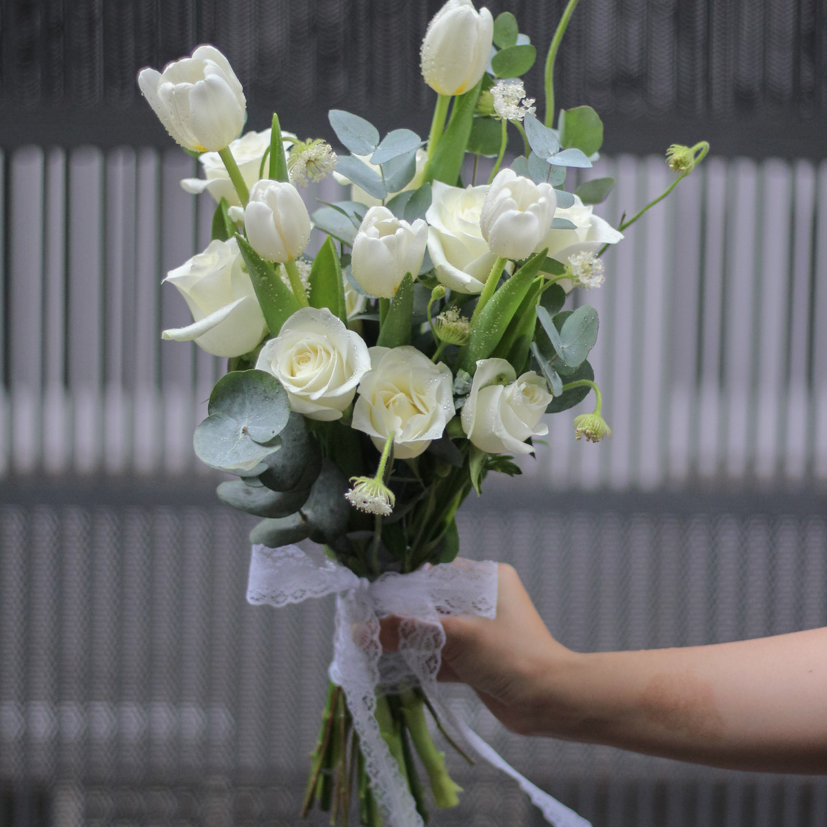Bó hoa cưới tulip trắng phù hợp 1m55-1m65