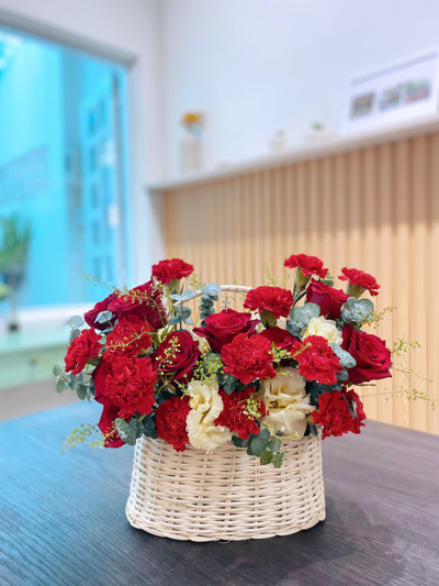 Giỏ hoa đỏ nhung với sắc đỏ rực rỡ phù hợp để tặng cho người thân nhân các dịp đặc biệt như sinh nhật, lễ kỉ niệm