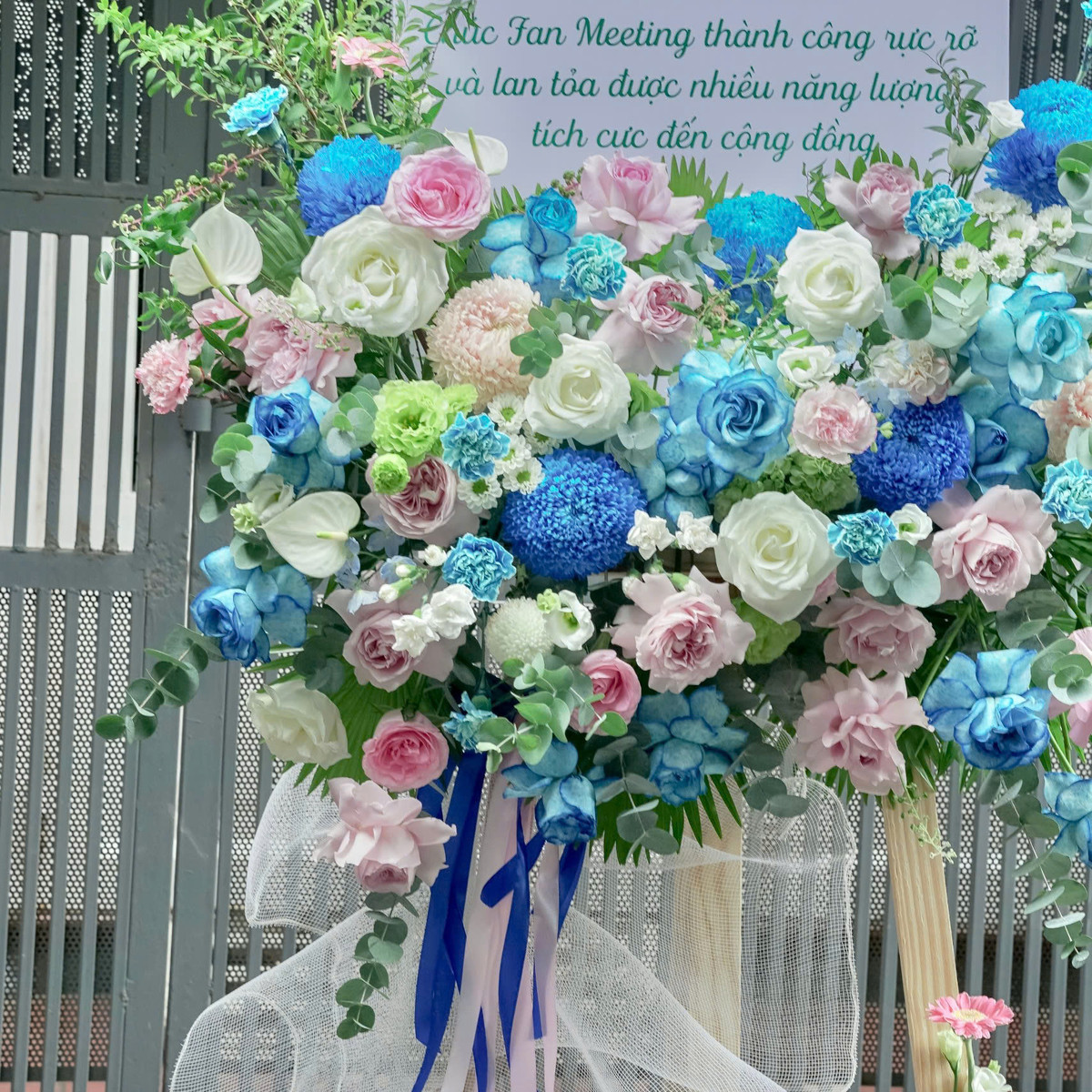 Kệ hoa trang chúc mừng sang trọng tone xanh dương là lựa chọn hoàn hảo để gửi gắm những lời chúc tốt đẹp đến người thân yêu trong những dịp đặc biệt. Màu xanh dương tươi mát không chỉ mang lại cảm giác bình yên mà còn thể hiện sự tươi mới và hy vọng cho tương lai.