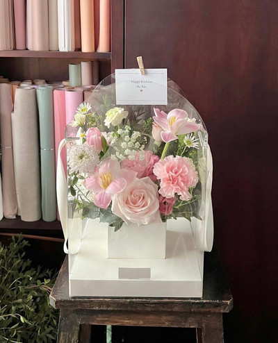 Giỏ hoa sử dụng hoa nhập khẩu, sáng tạo và nhẹ nhàng. Túi hoa sẽ phù hợp cho các cô nàng nữ tính, năng động